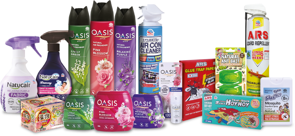 ALL EARTH HOME PRODUCTS including but not limited to ARS Insecticides and Repellents such as ARS Gokiburi Hoy Hoy, ARS Lizard Spray, ARS WHITE CAP, ARS Rat Glue Smart Pack . Cleaning Products such as Earth Air Con Cleaner Spray. Air Care Products such as OASIS Air Freshener Gel that made for long-lasting fragrance and is also able to repel mosquitoes. OASIS Air Fragrance, OASIS Natural Air Freshener. Natucair Dreamy Fabric Freshener which is able to help us to sleep better, at the same time also repel mites & kills 99.9% of bacteria & viruses. Bath Products that offers enjoyment and comfort for bath time while also relaxing both the body and the mind. These include longtime favorite carbonated bubble bath frizzies “Onpo”, & “Nihon No Meitou” which offers a taste of famous hot springs across Japan.